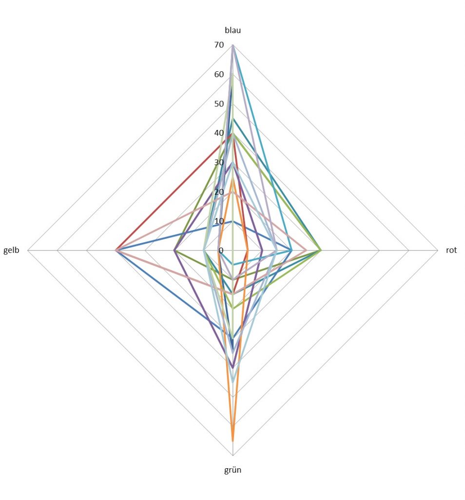 - Der gewissenhafte Typ (blau): vorsichtig, präzise, besonnen, hinterfragend, formal (steif, misstrauisch, kalt, reserviert, unentschlossen)