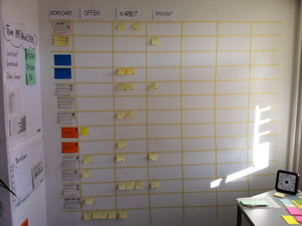 Das Taskboard wird anfänglich fast täglich weiterentwickelt und verändert, indem neue Prozessgruppen hinzugefügt oder aber auch wieder entfernt werden. Den Teammitgliedern wird von Beginn an das Anliegen mitgegeben, dass das Taskboard nicht als statisches Gebilde gesehen werden soll, sondern immer seinen Zweck der Sichtbarkeit von Aufgaben, Fehler, User Stories, usw. dienen muss.