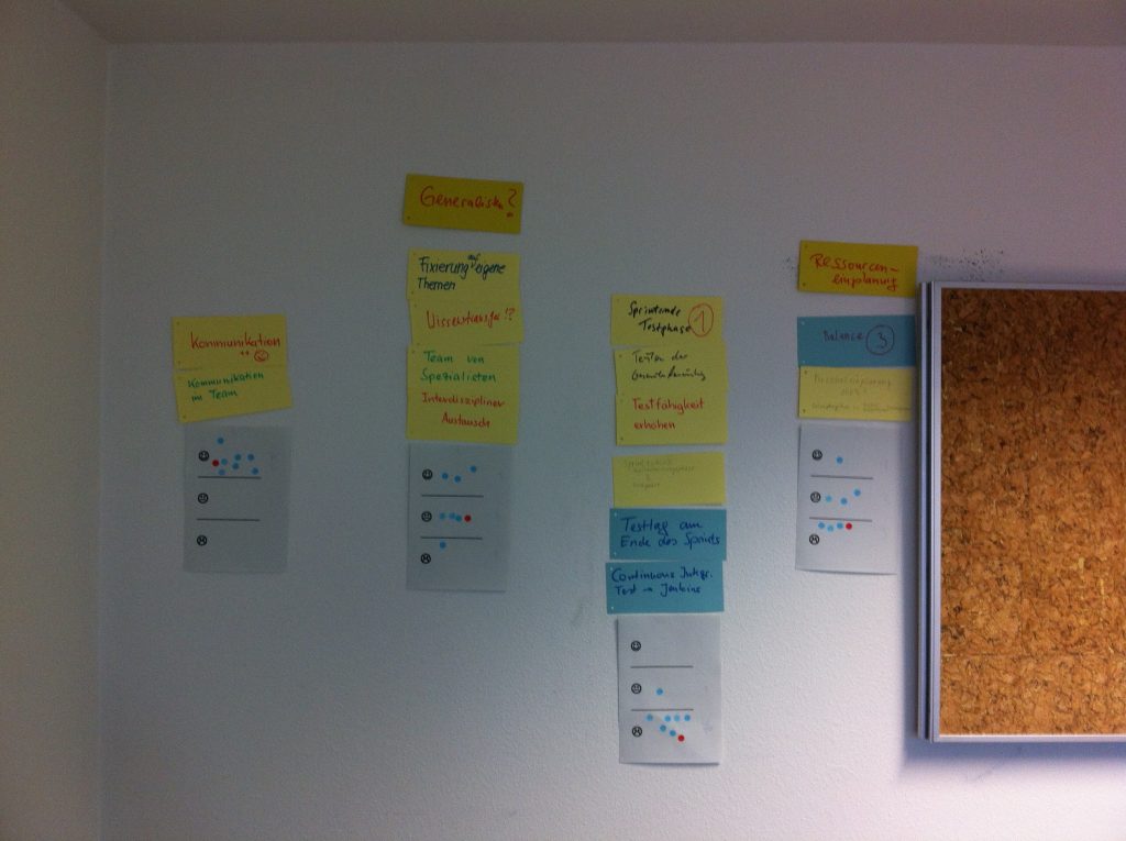 Ein wichtiges Werkzeug, zur Verbesserung von Prozessen, Steigerung der Produktivität, Leistungsfähigkeit und Qualität, war die Retrospektive. Hier fanden sich alle Teammitglieder am Ende einer Iteration ein und diskutierten Erfahrungen und Erlebnisse, die in der letzten Iteration gut oder weniger gut gelaufen sind.