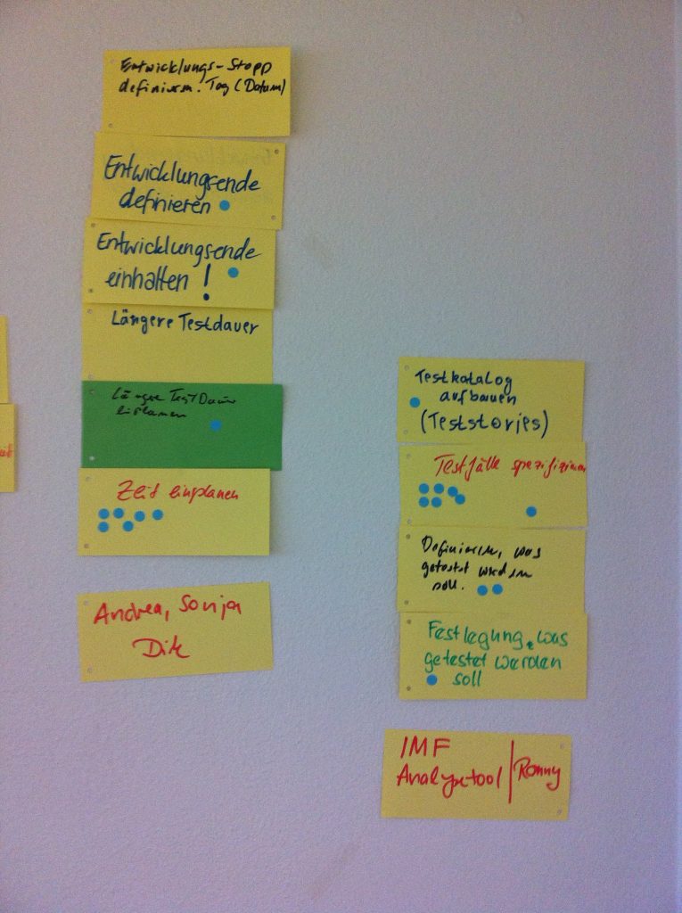 Nachdem das Thema Testen als das wichtigste Thema identifiziert wurde und das Team sich die Frage stellte, was man bei der nächsten Iteration beachten muss um besser zu werden, wurden die verschiedenen Prozess-Schritte auf Karten niedergeschrieben. Da nicht alle Prozess-Schritte verbessert werden müssen, sollten die Teammitglieder diese markieren, bei denen die meisten Probleme auftraten. Hier wurden die Prozess-Schritte und Vorgänge »Zeit einplanen« und »Testfälle spezifizieren« ermittelt und auch die Verantwortlichen festgelegt, die in der nächsten Iteration diese beiden Themenkomplexe besonders beobachten sollen (siehe Abbildung »Identifizieren von Verbesserungen«). In der Diskussion anschließend wurden Lösungen gefunden und Commitments geschaffen wie die Verbesserung der beiden Themen umgesetzt werden können.