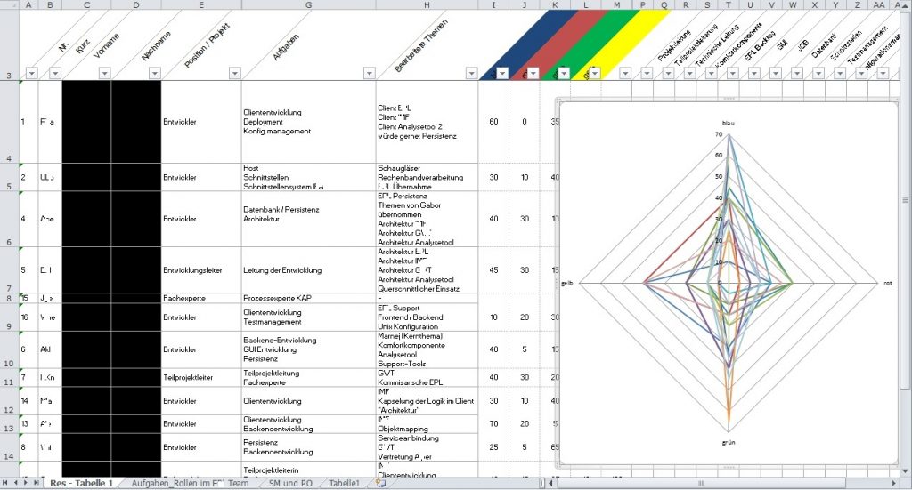 Diese Ergebnisse können dann sukzessive im Verlauf des Projektes vom Projektleiter (oder Scrum Master) nachjustiert werden. Die Anpassung kann im Verlauf eines Projektes notwendig sein, da getroffene Einschätzungen von den im Projekt beobachteten Faktoren abweichen oder sich Personen aufgrund ihrer neuen Rolle und ihren Aufgaben von ihrem vorhergehenden Persönlichkeitsbild bzw. den Stärken verändert haben.