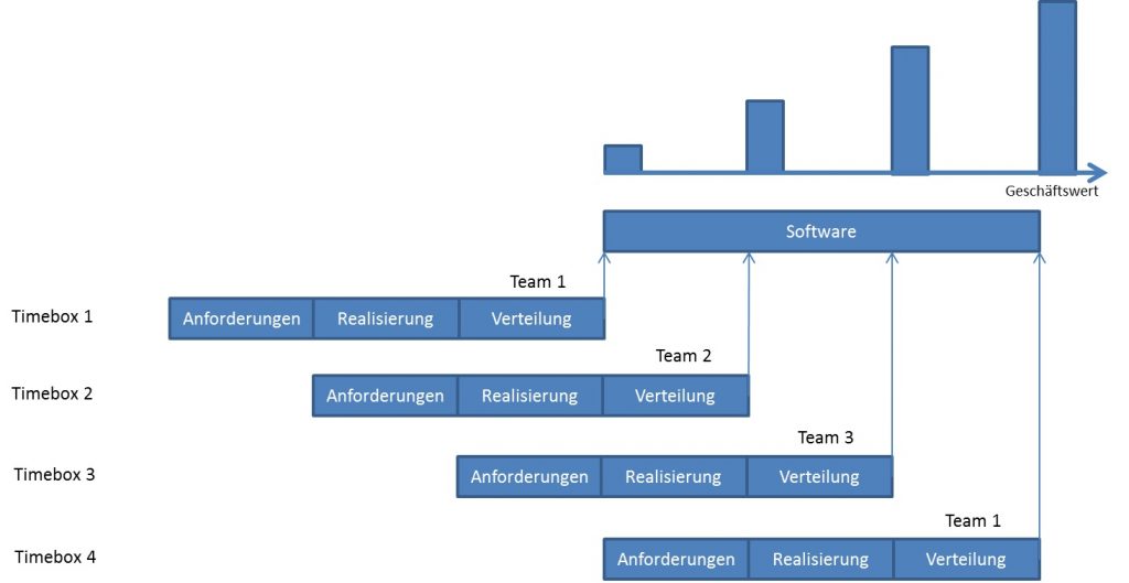Der gesamte Entwicklungsprozess wird hier in viele kleine Iterationen unterteilt, die nicht nur seriell, sondern auch parallel in verschiedenen Teams (siehe Abbildung »Iteration und Timebox«) ausgeführt werden können.