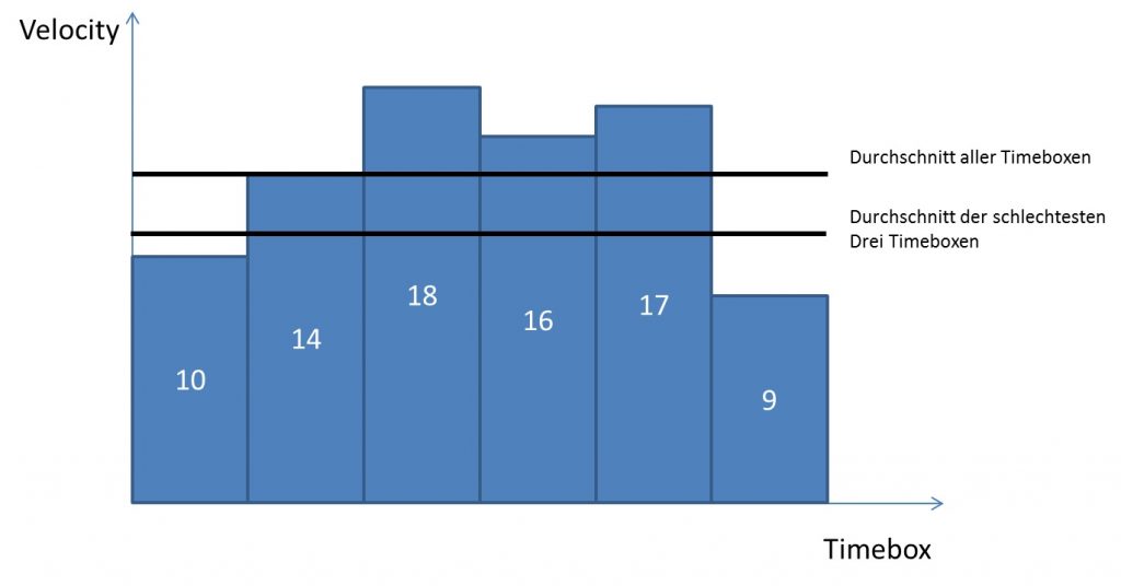 Die Abbildung »Entwicklungsgeschwindigkeit« zeigt in den ersten drei Timeboxen einen typischen und positiven Verlauf in der Anfangsphase. Die nachfolgenden Timeboxes können zum Beispiel durch Fehlzeiten, Hindernisse, Urlaub[10], etc. beeinflusst werden. Je mehr Iterationen man durchläuft, desto genauer werden diese Vorhersagen.